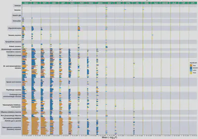 We tested for associations with 231 cell types from the mouse central, peripheral and enteric nervous systems. We used single cell transcriptome data from @slinnarsson recent cell type atlas.