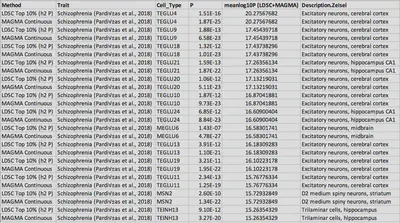 As with our previous schizophrenia findings, the strongest signals were in cortical + CA1 pyramidal neurons, D2 medium spiny neurons, and Reln/Ndnf expressing interneurons. Importantly however, we also found another strongly enriched cell type in the superior colliculus (MEGLU6)