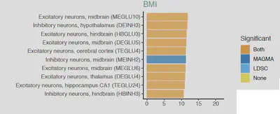 BMI had strongest associations with neurons in the midbrain (MEGLU10), hypothalamus (DEINH3) and solitary nucleus (HBGLU3). The hypothalamus is plays a major role in weight regulation, and the solitary nucleus is involved in gustatory processing and projects to the hypothalamus