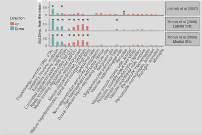We then used EWCE to find cell types altered in human post-mortem Parkinson’s disease brain. In three seperate studies, downregulated genes were specifically enriched in dopaminergic neurons, while upregulated genes were significantly enriched in oligodendrocyte lineage cells.
