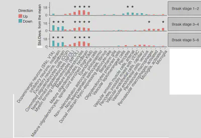 We then analysed data from post-mortem human brains which had been scored by neuropathologists for their Braak stage. This showed that upregulation of oligodendrocyte genes is already found at Braak stage 1/2 which precedes dopaminergic neuron downregulation and degeneration.
